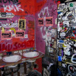 The bathroom of the former Creepy Crawl music venue in St. Louis, Missouri, is covered in graffiti and flyers from bands that performed there. The venue, which operated from the late 1990s until its closure in 2009, was a significant space for the local independent music scene. This space served as a canvas for the venue's patrons and performers, reflecting the vibrant and often ephemeral culture of underground music.