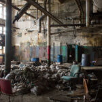 The interior of the abandoned Dixie Brewery in New Orleans is filled with debris, including large piles of trash bags,…