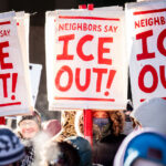 A box truck in South Minneapolis bears graffiti reading "Free Wall Express How Ice Makes You Feel...". The phrase likely references "ICE," the U.S. Immigration and Customs Enforcement agency, and may allude to the agency's enforcement practices or the emotional impact of immigration policies. This message appears amidst a backdrop of parked cars on a street lined with bare trees, suggesting a winter setting. The presence of such graffiti on commercial vehicles can serve as a form of public commentary or protest, utilizing mobile canvases to convey messages throughout the urban environment.