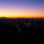 Sunrise over the Los Angeles basin from Mulholland Drive overlook, with the downtown skyline visible in the distance.