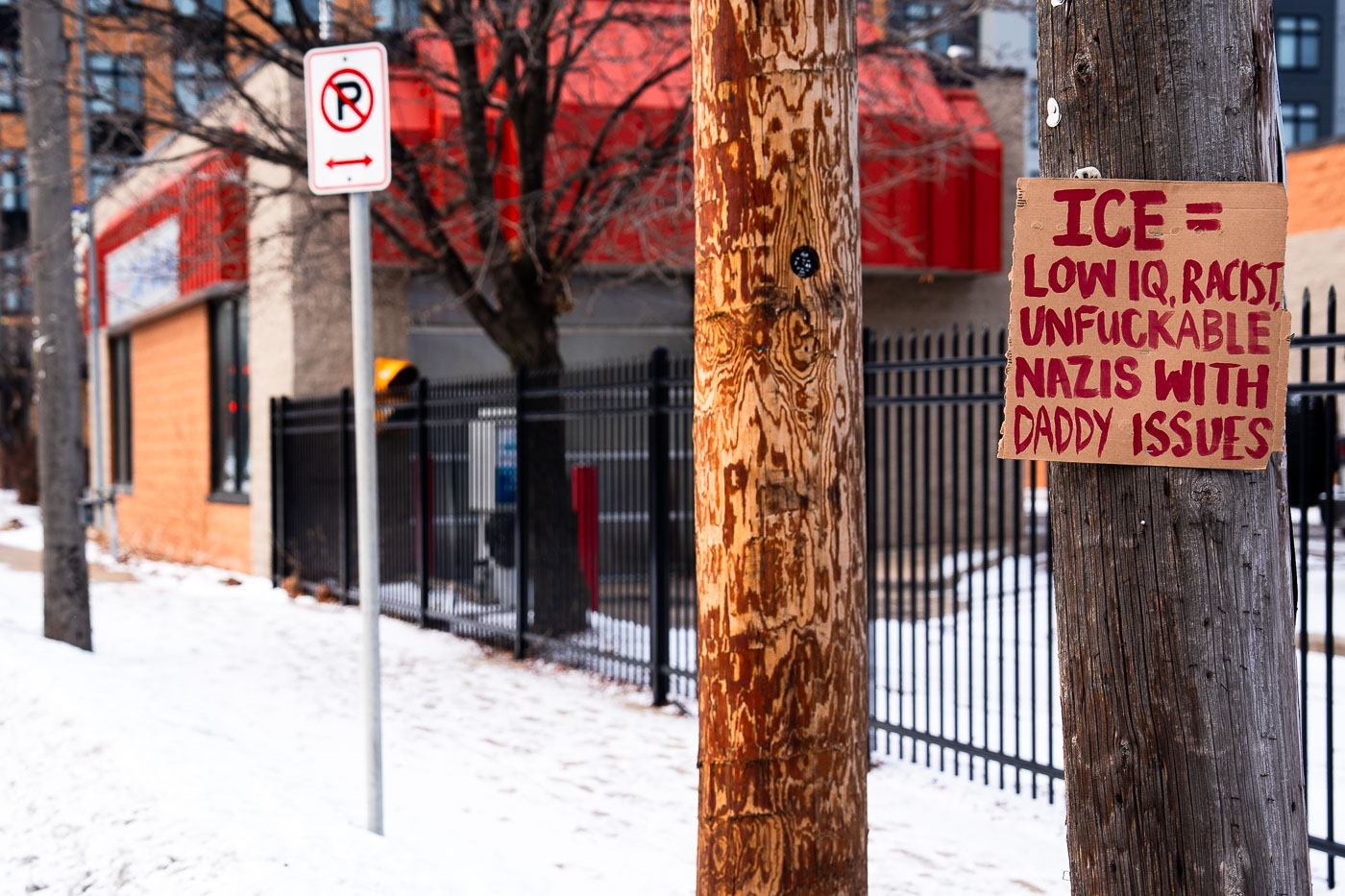 A handmade sign attached to a wooden utility pole reads "ICE = LOW IQ, RACIST, UNFUCKABLE NAZIS WITH DADDY ISSUES" in red lettering. The sign is visible on a snow-covered street in South Minneapolis, with a black metal fence and buildings in the background. This image documents a protest against Immigration and Customs Enforcement (ICE) operations in the Twin Cities. The sign reflects public sentiment during a period of increased immigration enforcement activity in the area.