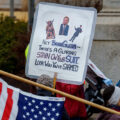 Protester at the Minnesota State Capitol on February 5, 2025 holding up a sign that reads "We defeated nazis once we can do it again".