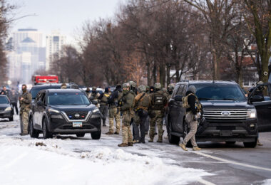 Signs hang on the fencing around the Minneapolis Police 3rd Precinct police station. The station burned 4 years ago on…
