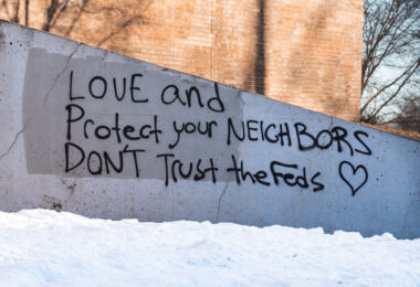 Graffiti on a Minneapolis Public School entrance area that reads "Love and protect your neighbors don't trust the feds" [filedunder]