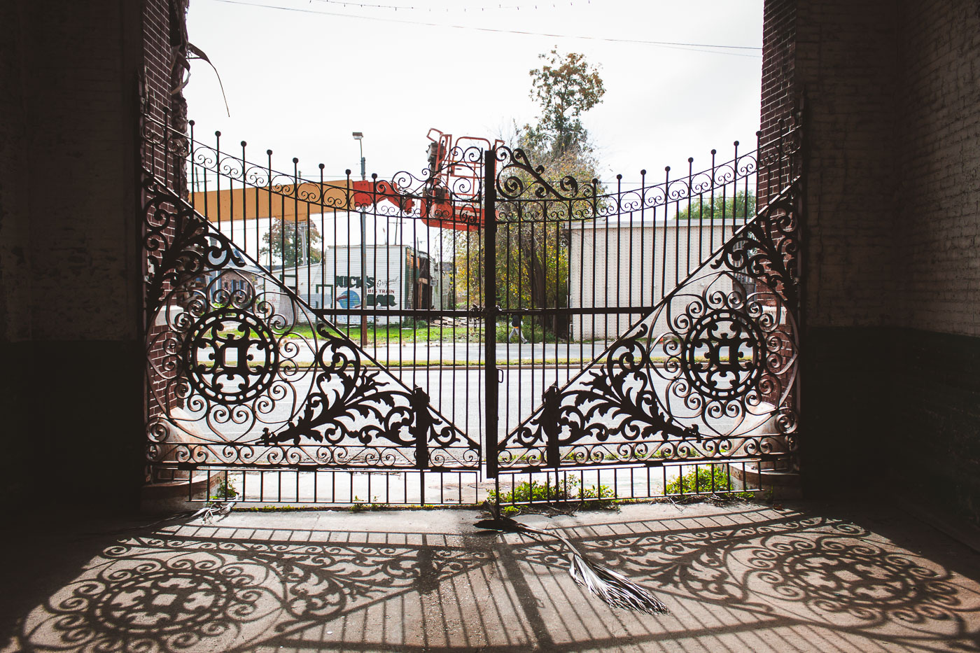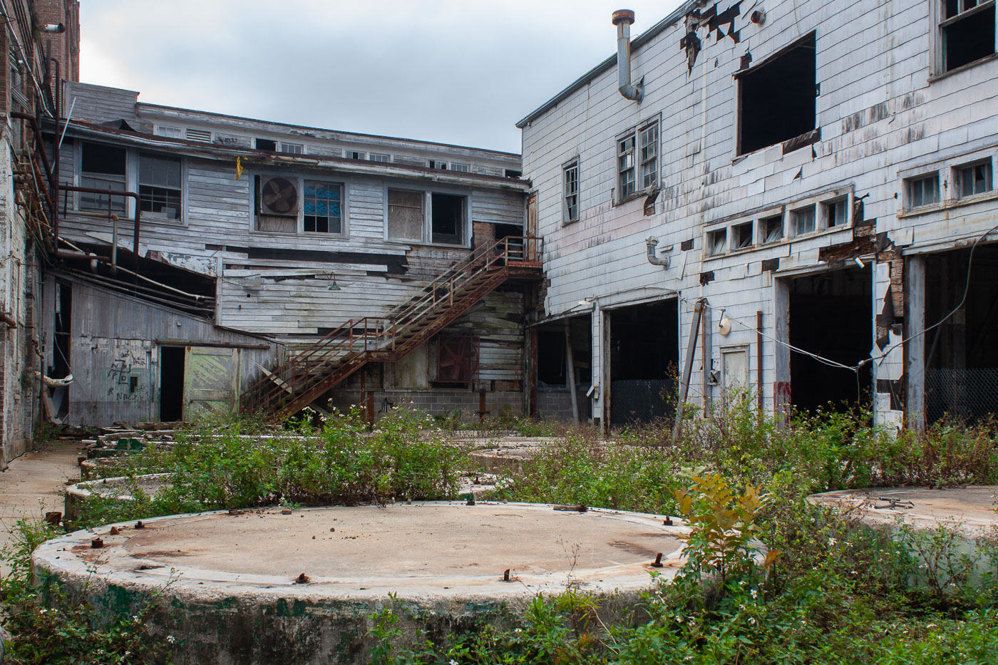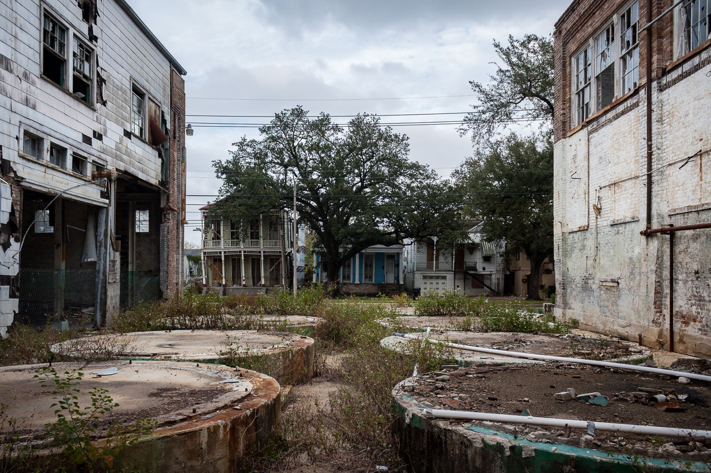 Photographs of the vacant Dixie Brewery complex in New Orleans showing interiors, machinery, tanks, gates and graffiti